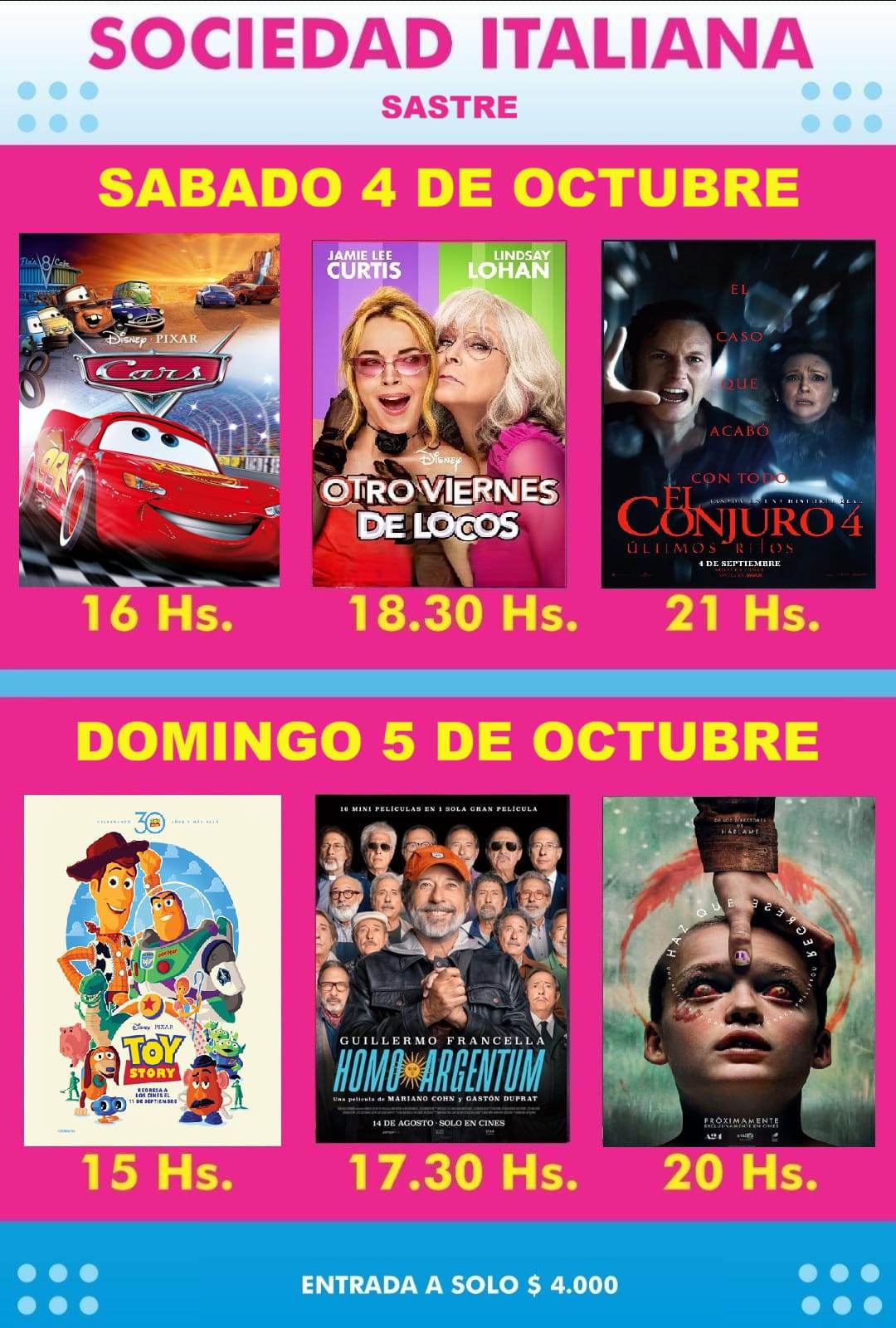 Sastre se prepara para un fin de semana a puro cine con una doble jornada de proyecciones el sábado 4 y domingo 5 de octubre. La cita es en la Sala Monticello D´Alba de la Sociedad Italiana, que ofrecerá un total de seis películas para el disfrute de grandes y chicos.