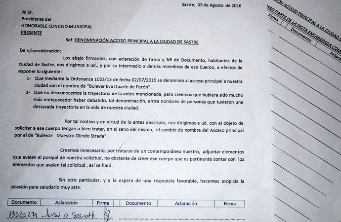La carta está fechada el 5 de agosto y dirigida al presidente del Consejo municipal. La misma queda abierta para que el reclamo lleve la firma de los ciudadanos que estén dispuestos a poner su nombre al final de la hoja. “Nos dirigimos a usted con el objeto de solicitar a ese cuerpo tengan a bien tratar, en el seno del mismo, el cambio de nombre del acceso principal por el de Bulevar Maestro Olindo Strada”, sostiene un fragmento de la solicitada.